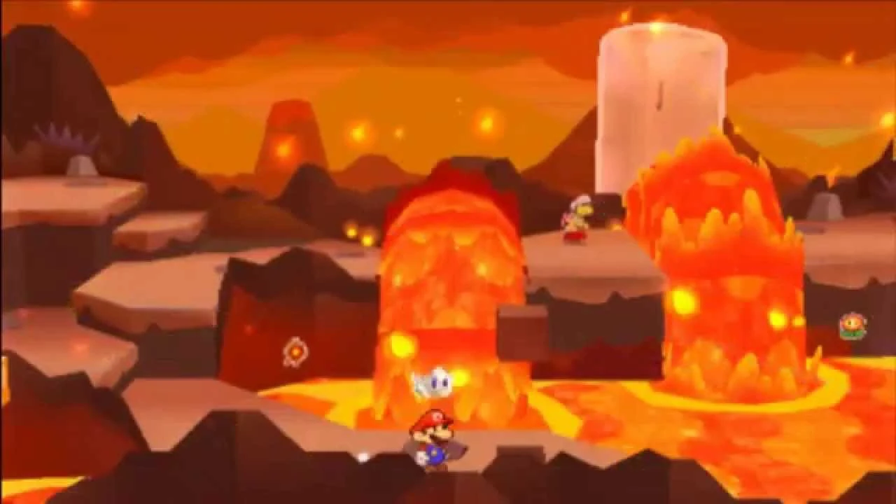 Lava returns in Paper Mario: The Origami King in Hotfoot Crater. Lava is seen around the volcano, falling into the lava once again drops Mario's HP, Paper Macho Podoboos are also seen hopping out of the lava pits and rain down on Mario, Bowser Jr., and Kamek similar to a meteor.