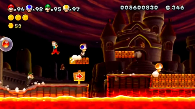 The Mario Crew dashing across the now-lava riddled Peach's Castle.