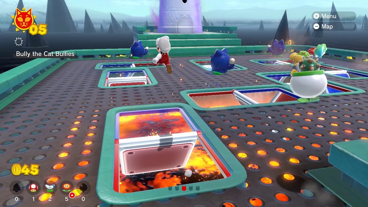 Lava is less common in the Bowser's Fury side of Super Mario 3D World + Bowser's Fury but it is seen in a few missions, most notably Bully the Cat Bullies which involves Mario and Bowser Jr. having to push the Cat Bullies into the lava for a Cat Shine.