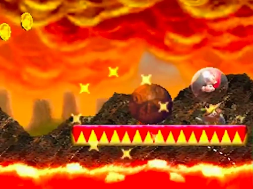 Lava is also seen in Yoshi's Island DS, in this game, it is once again a one-hit-kill obstacle. The game retains a similar design to it's predecessor and lava dwellers from the previous game Podoboos, Co-Blarggs, Gargantua Blarggs, and Hot Lips all return alongside the new Crusher Blargg. The game also features cascading lava in lava caverns as well as Lava Falls which can both kill you instantly, lava is commonly found in Castles and Scary Castles as well as underground caverns and some Secret/Extra levels. Lava is also seen in the Subterranean Exhibit of the Island Museum and one part of the Giant Exhibit for lava-dwelling enemies. Lava is first seen in Castle of the Big Burt Bros.