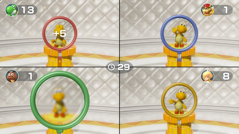 The player must adjust the magnifying glass with the Joy-Con by moving it closer or further to make the character seen sharply. The first player to make the character seen sharply with the magnifying glass earns 5 points, second earns three points, third earns one point while the last has no points.