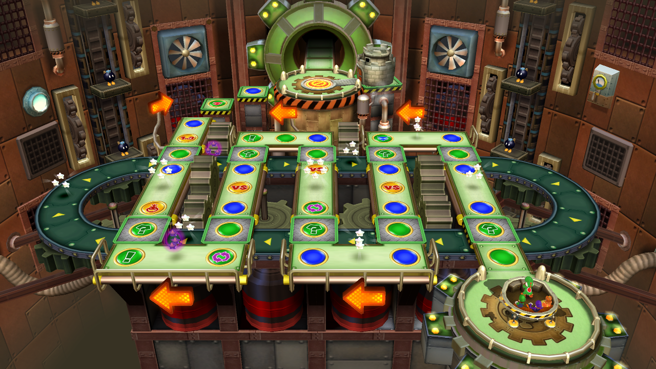 | Bob-omb Factory | Bob-omb Factory is the second board. Players move around a room full of conveyor belts, and if the Captain lands on a Happening Space, the conveyor belts will move the group of players around, including spaces. After the mid boss battle, Bob-ombs will intrude on the vehicle and will explode after 10 moves. Whatever the Captain happens to stop the Bob-omb's countdown, half of the Captain's Mini Stars are lost. | Side-by-Side Zone |