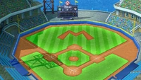 Once arriving at Mario Stadium, Mario throws the first pitch, in which Daisy hits. The scenery immediately changes as the ball is chased after by Toad in the Peach Ice Garden until he runs into a large Freezie and turns frozen solid upon collision. He is later freed by a Blue Toad, who accidentally crashes into the Freezie (with Toad revealing that he made the catch after being defrosted). The scene readjusts to Wario City, where Wario fields the ball, only for to shoot into the air from a manhole water spout. The ball lands on Wario's head, causing him to fall backwards. At Yoshi Park, Yoshi jumps over a pipe to catch the ball, but realizing that he is going to fall, he flutters around, but falls in with the ball; all while Birdo watches and does nothing. At the DK Jungle, Diddy Kong witnesses a giant barrel coming his way until Donkey Kong smashes the barrel into fragments, giving his nephew a sigh of relief.