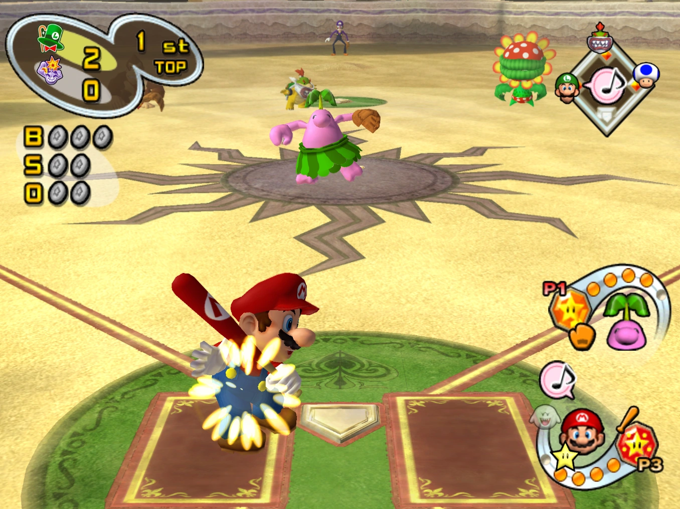 With two outs and the game on the line, Mario is up to bat; as he faces down Wario, he points his bat at the stands in an homage to Babe Ruth's called shot. Wario then lets loose a pitch that Mario manages to hit as everyone watches in awe—the ball sails directly into the stands where Mario pointed, scoring a home run for him and his team (despite the fact that Mario's team was already up by one run and therefore the game should have ended before his turn to bat). Peach, Luigi and the others celebrate their victory with Mario as he reaches home base; as they do, Bowser is shown in the audience, chuckling to himself.