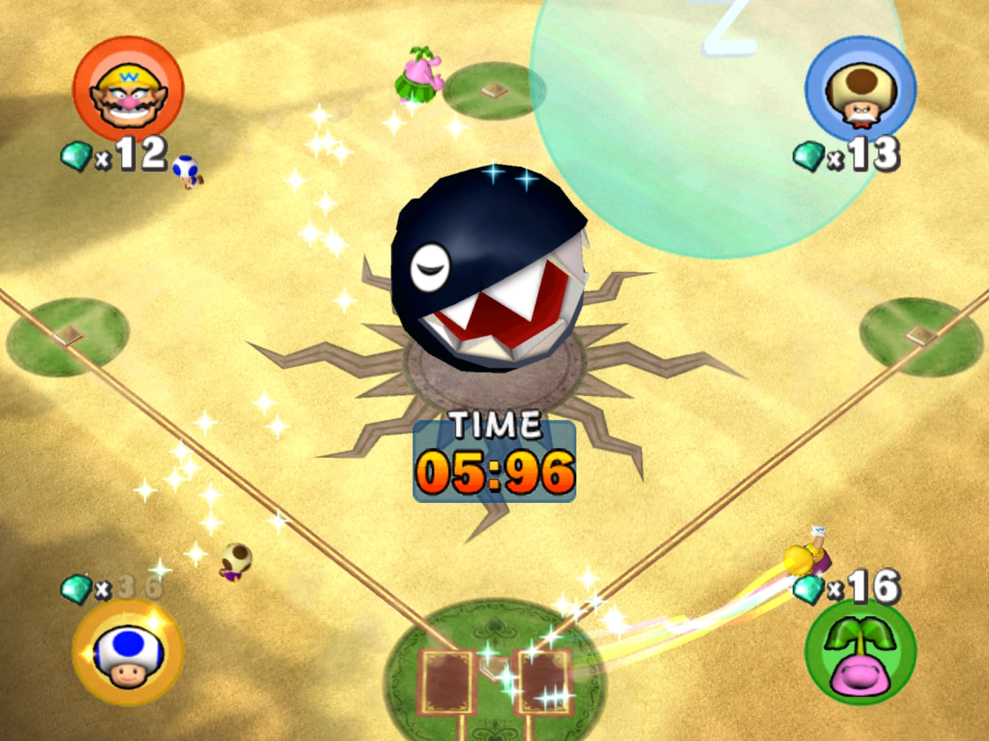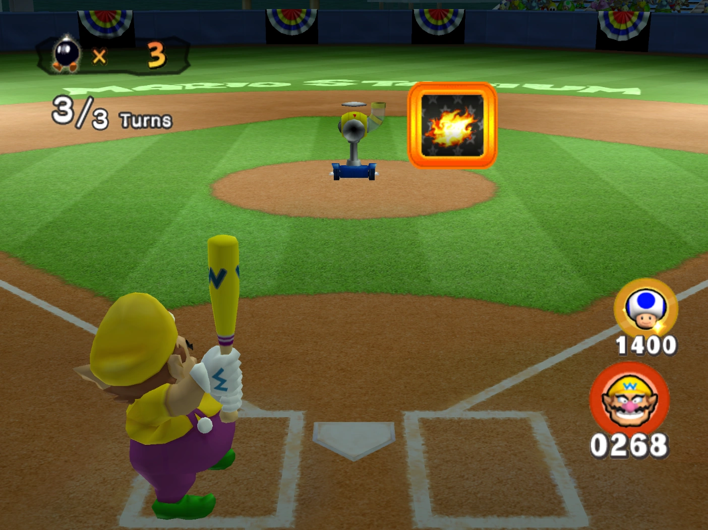 In the match between Peach and Yoshi's teams, Peach gets a good swing on a pitch, and as Yoshi runs to make the catch, it bounces off a Note Block and becomes a home run, much to Yoshi's disappointment. Next, in the game between Wario and Donkey Kong's teams, Donkey Kong uses his climbing abilities to catch the ball, but is bitten by a Chain Chomp and forced to drop it. Shortly after, Diddy Kong successfully bunts, and Wario desperately tries to blow the ball into foul range, but to no avail—Lakitu calls a fair ball, leaving Wario to slam his fist into the ground in frustration.