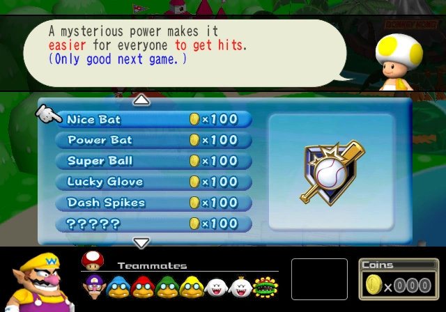 Challenge mode is the main game mode. One player selects one of five Team Captains (Mario, Peach, Donkey Kong, Wario, and Yoshi) and plays with a pre-made team. The player wanders a map of the Mushroom Kingdom and can play minigames to earn coins and spend at a Shop, where power-ups can be bought. The player's objective is to beat the other four captains in a game of baseball, on their own course. In order to get the others, the player should see the scout flags for the match. Scout flags are earned by completing scout missions, such as getting a hit, or scoring a run. If the scout mission is not completed, the player will not earn the scout flag(s). There are scout flags next to the characters' faces. These flags serve as a purpose for recruiting other characters to the player's team. Each character has a set number of Scout Flags (up to five flags), with team captains requiring more Scout Flags (3 on the Mushroom level, 4 on the Flower level and Star level, and 5 on the Special level) and sub-captains and characters of race (excluding the characters with color changes) needing the median number (2 on Mushroom and on Flower, 3 on Star, and 4 on Special) and minor characters needing the least (1 on Mushroom, 2 on Flower and Star, and 3 on Special).
