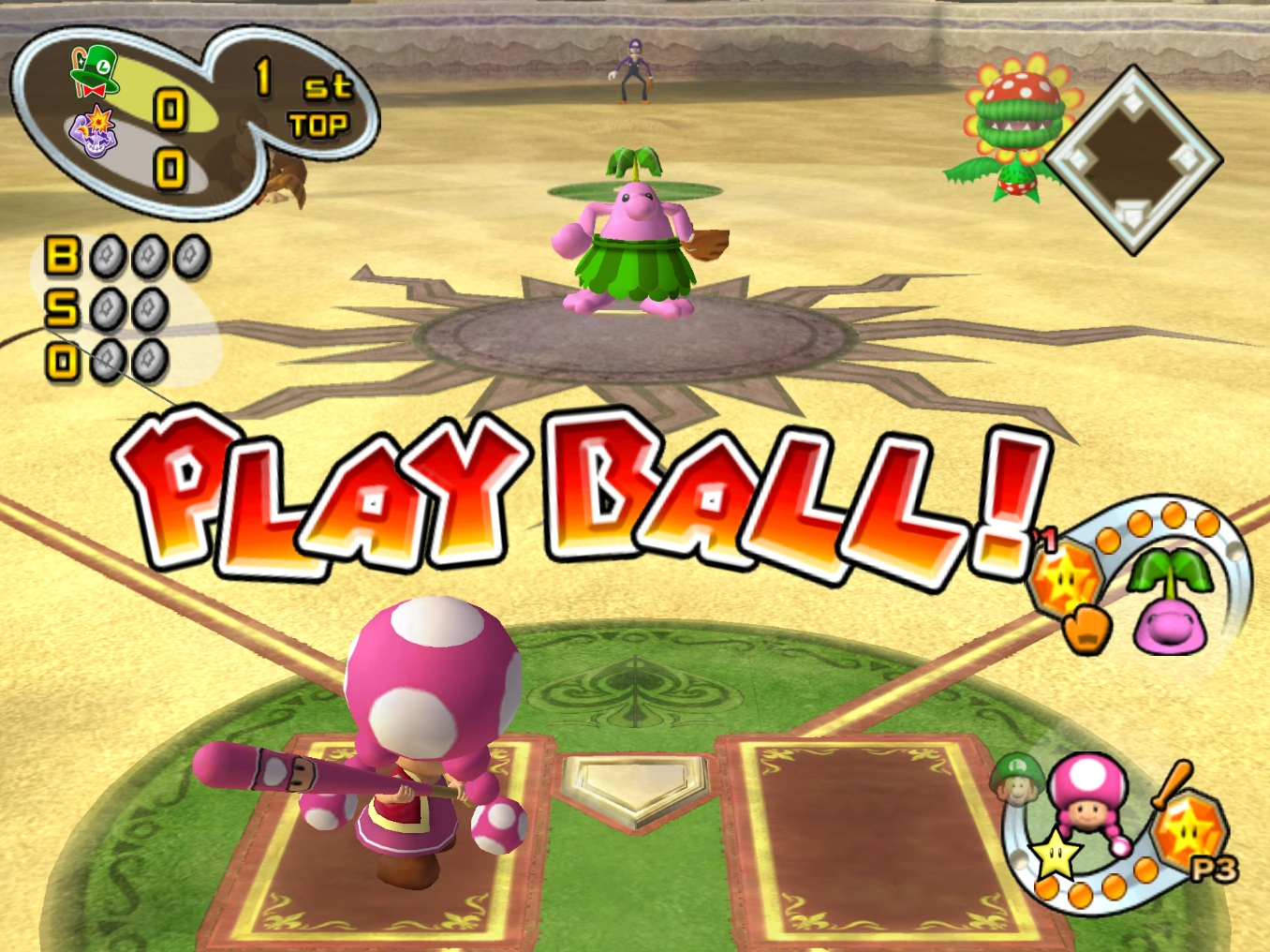 Toy Field is a mode up to four players can participate in a special field. Players take turns hitting pitched balls into a field made up of many spaces. Players earn coins depending on where the ball has landed. The player with the most coins wins. Items can be used to either help or deter a player's progress depending if the ball landed on a ? area. Players can also get coins by striking a player out or catching a fly ball.