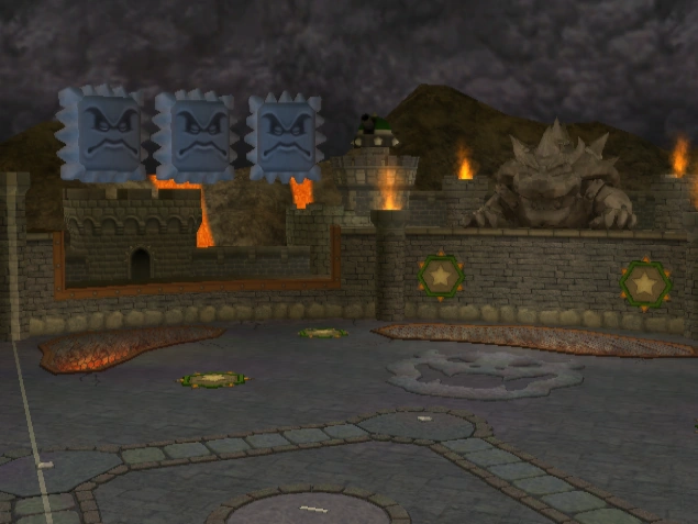 A ballpark inside Bowser's castle. Flying fireballs are found in chain link lava picts and they harm anyone who touches it. Thwomps also crash down to stop any would-be home run balls. Star panels give out Star Skills when they get touched in this stadium.