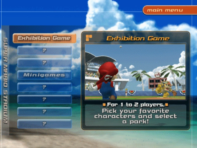 Exhibition mode is a standard one or two player game of baseball. Players fill out a roster and play a game. There are six different, unique stadiums in which players can choose to play in. The player, before playing in a stadium, can adjust options such as number of innings, mercy, which player bats first, and turning Star Skills on and off. Players can also adjust field settings, running, drop spots, and batting cursors.