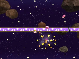 The two characters compete to make their way through an asteroid belt in outer space. The goal for each character is to reach the end first. The asteroids serve as obstacles, because if a character hits one, they spin around in a fixed position for a few seconds. At the same time, the asteroid is knocked out of the way. Whoever passes through the goal ring at the end first is the winner, but if both players do so simultaneously, the minigame ends in a tie.