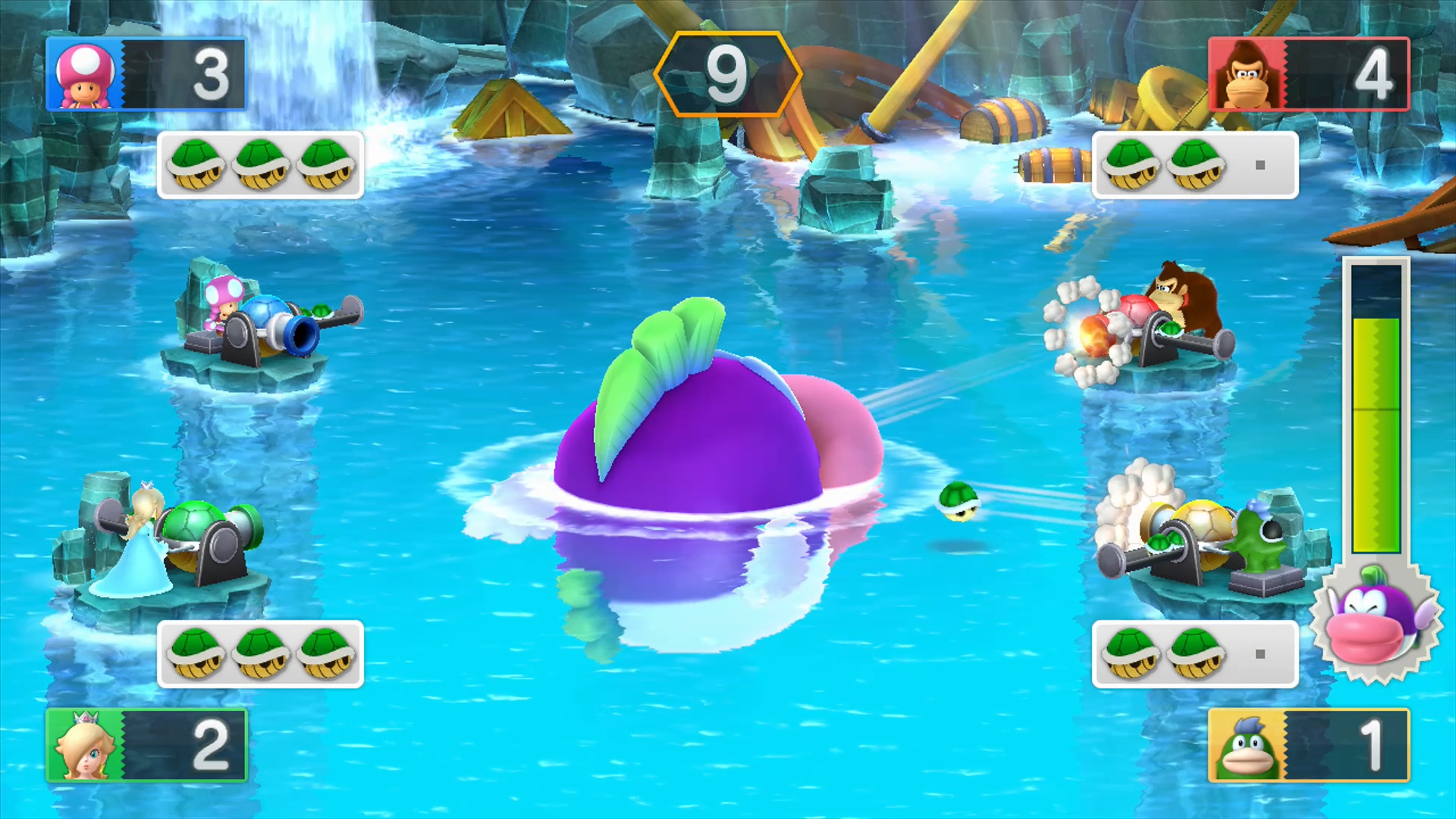 The characters will have to attack the Mega Cheep Chomp by shooting Koopa Shells at him. Each Koopa Shell that hits the creature will make him turn ninety degrees clockwise (causing him to face player 1 first, then 2, then 4, then 3, and back to 1) and gives one point. The Mega Cheep Chomp will charge at the character in his line of sight and make that character lose points one the timer runs out. This cannot be avoided. In the second section of the fight, some Cheep Cheeps start circling the Mega Cheep Chomp's location at the centre, acting as shields for his body and blocking one Koopa Shell apiece before getting knocked out. The Mega Cheep Chomp has 64 hit points.