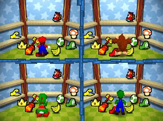 Before the minigame starts, players have to try to memorize the items' locations on the shelves with the next few seconds they have. After that, many Toads (specifically red Toads in Mario Party Superstars) come onto the screen and tamper with the toys behind a cloud of white smoke. Once the Toads are done, the game reveals that they knocked down some of the items, leaving some in their proper places. The screen splits into four.