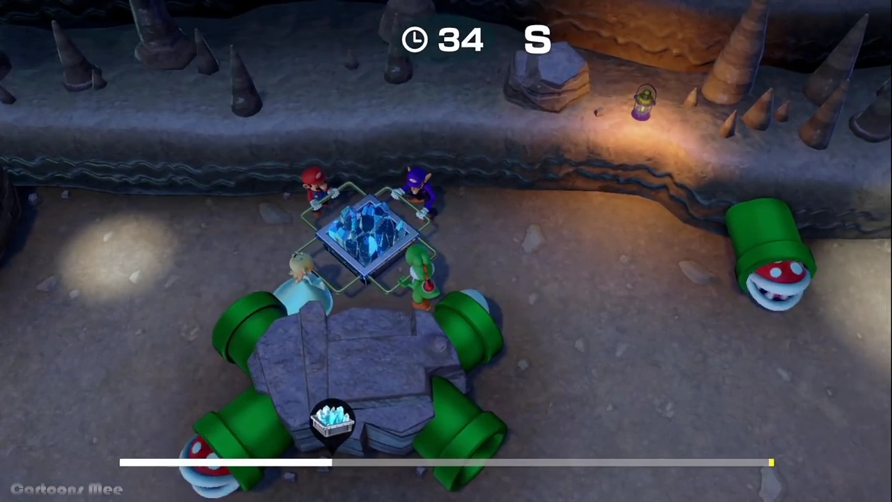 Every player are holding each side of the cart with crystals, they must work their way to the finish line avoiding the Piranha Plants coming out of the pipe, otherwise they will be stunned for a few seconds. There is a meter that shows how close the team is to the goal.
