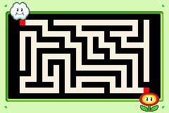 The game features a small maze with a total of a total area of 299 squares (23 squares wide, 13 squares high), with a Lakitu's Cloud marking the starting point and a Fire Flower marking the end. The design for the maze itself is very simple, with white squares acting as pathways and black squares acting as walls.