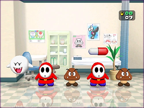 Five partients are in a hospital: either a Toad, Goomba, Boo, Shy Guy, or Koopa Troopa. Each of them is given a Poison Mushroom, but only one of the patients is infected. The player has to give the pill to the infected patient. They must find out which patient was infected by hearing (or by looking at heartbeat symbols if the Rumble option is off) the patients' heartbeats through the controller rumbling. The patient who has the different heartbeat is the one infected. The player has a limited amount of time to find the sick patient; this starts at twenty seconds, but the number of seconds decreases by one every round up until the sixteenth set of patients onward, which have a five-second limit. If the player chooses the right patient, they are happy, and a new set of patients arrives.