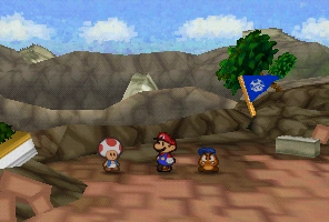 A Paper Mario screenshot of Mario and Goombario next to Muss T.