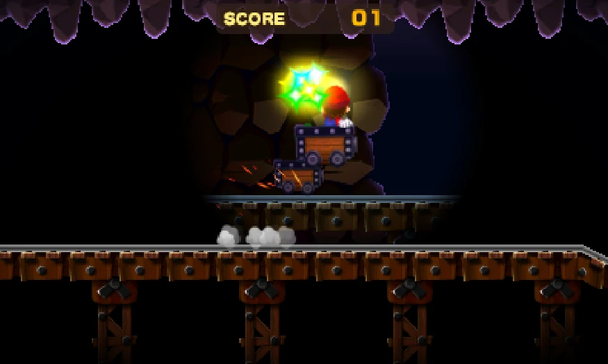 Mysterious Mine Carts reappear in the remake of Superstar Saga . In the 3DS version, the tracks looked more like railroad tracks than in the GBA version. Minecarts are brown instead of gray. The stalactites are colored purple instead of brown.