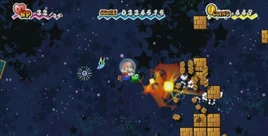 The heroes make it back into space and Squirps informs everyone that they are finally in the Space Byway. He says they'll make it to the Whoa Zone from here but Tippi doesn't believe him fully due to the odd name. Squirps says to just trust him and they all head on forward. Eventually, they come across a Space Gate that can only be opened by placing Squirps in the spot. The heroes soon reach one where it requires two Squirps and Squirps soon grows hungry and is too hungry to move from the spot. Mario and the others are forced to head out into space and find the Twinkle Mart to buy a Sweet Choco-bar. After giving Squirps one, he multiples into two and opens the Space Gate. The heroes head on and finally make it to the Whoa Zone.