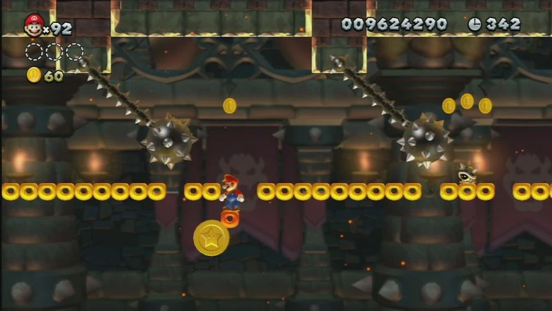 - Star Coin 2: Directly after the first Star Coin, the player should wall jump into a hidden area with a Warp Pipe. In there, the star coin is blocked off by three giant Ball 'n' Chain. A Starman, which can be found in the ? Block on the other side of the area, is required in order to safely obtain the second Star Coin.