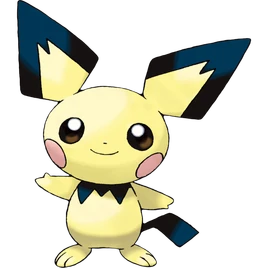 Pichu is a small, ground-dwelling rodent Pokémon with pale yellow fur. Its eartips, collar, and tail are black and angular. Pichu's pink cheek pouches can store small amounts of electricity, and its tiny nose looks like a dot. Pichu is classified as a quadruped, but it can walk easily on its hind legs.