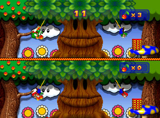 Teams in their hanging ropes swing back and forth, and the minigame starts. One player on the team has to grab the cherries dropped by a Ukiki and throw them to the other player, who then puts the cherries in the basket to earn points. The size of the cherries affects how far they fly when thrown. The team that has more points at the end of the minigame wins. If both teams get the same score, the minigame ends in a draw.