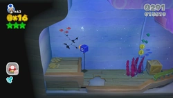 - Green Star 2: After getting the stamp, go on the right side of the room to get a cannon box for the star. Swim to the bottom to break open a crack in the wall. It reveals a pipe leading to a hidden area with the star.
