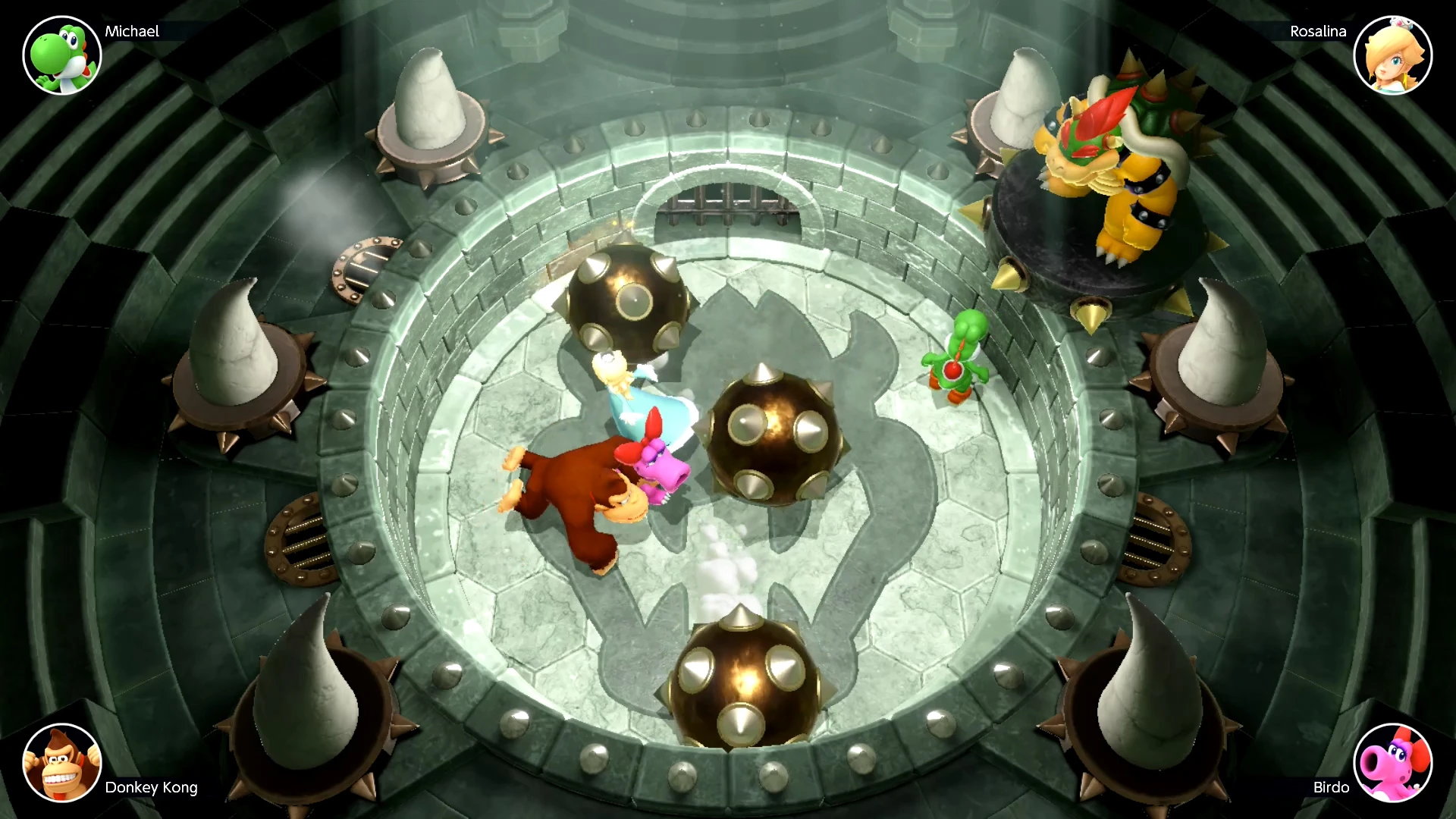 Players have to avoid a large Spiked Ball thrown into the pit by Bowser. If a player hit hit, they are eliminated and land into a cage. When the Spiked Ball loses speed, Bowser angrily throws two more of them into the pit, which hit the first one and cause it to start rolling again. Whoever survives until all the Spiked Balls stop moving is the winner. If all remaining players are knocked out (Mario Party 6), or if everyone is eliminated by having a spiked sphere simultaneously knock against them (Mario Party Superstars), the minigame ends in a tie.
