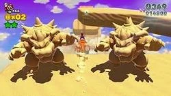 At the start of the level, the player must hop on Plessie. After hopping on, Plessie will take a large leap into the sand. Here, the player encounters Dash Panels as well as sand sculptures of Goombas. This level also features various enemies and sand sculptures of Bowser.