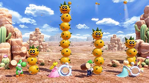 The players are standing in a desert when four Pokeys rise out of the ground. Hammers then appear in each of the playable characters' hands.