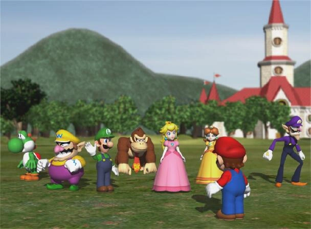 The characters near Peach's Castle in the opening cinematic for Mario Party 4