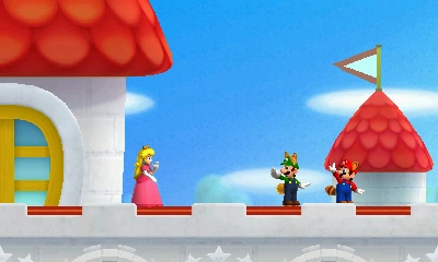 Princess Peach's Castle is first seen during the intro, specifically on the balcony, where Mario and Luigi (in their Raccoon form from Super Mario Bros. 3) wave goodbye to Princess Peach as they set off to go on a coin hunt. It makes a background appearance in World 1-1. Princess Peach's Castle has the same appearance as in New Super Mario Bros. Wii, but like in New Super Mario Bros., the interior is never shown.