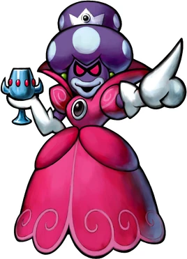 Princess Shroob is the main antagonist of Mario & Luigi: Partners in Time. Hence her name, Princess Shroob is the second-in-command of an alien race, the Shroobs, though initially, it appears that she is their leader, although her sister Elder Princess Shroob really is. She resembles the rest of her race in color, but is taller with a proportionally smaller head, and wears a dress, similar to Peach's dress. She is the penultimate boss of the game and the game's sixth major boss.