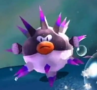 Puffer Fish are enemies found in the Super Mario Galaxy games. They are very rare enemies and commonly inhabit underwater coves. They reveal themselves as Mario (or Luigi) approach and then charge at them and self destruct upon contact or if they linger for long enough.