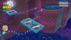 When reaching the pair of shiny platforms, tap the second one to reveal a hole to fall into and ride the platform to the Goomba stamp.