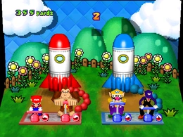 In this mini-game, the two teams must pump air into their rockets to power it. The players of the two teams must work together and fill the rocket with much air as they can before the time ends. After that, the rockets are launched into the air and whichever is higher, that team wins.