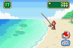 The player's character—either Mario, Luigi, Peach, or Yoshi—is standing out on a beach with a fishing rod. They cast the line of their fishing rod into the ocean, then the game starts.