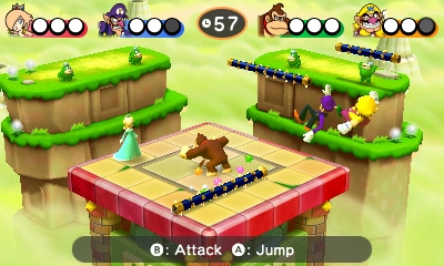 | Minigames | Free-for-All | Acornucopia • Block Busters • Blowboat Battle • Bridgesaw Puzzle • Bumper Bugs • Conkdor de Force • Corkscrew Climb • Dodge Fuzzy, Get Dizzy • Fruit or Foe • Fruit Parade • Goomba Guess • Greedy Eats • Haunted Hallways • Jewel Janitors • Jump to Conclusion • Lava Labyrinth • Parkour War • Piranha Plantemonium • Piece of Cake • Pop Quiz • Roller Revenge • Rolls for Moles • Shooting Stars • Splat-a-Stamp • Top It Off • Wheelin' and Wigglin' |
