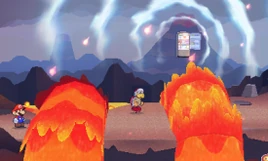 After exploring the Chomp Ruins, Mario clears through the jungle and steps into the heat of Rugged Road. As he treads across the burning path, Mario must avoid falling rocks that rain in from above. Mario eventually works around the hot path and nabs the Comet Piece to clear the level.