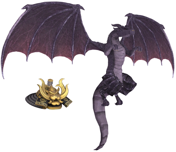When first meeting him, the Ruined Dragon is seen wearing a golden crown featuring the shape of Bowser's head on it, as well as various horns and a black cloth with golden motifs similar to the ones seen in Bowser's Kingdom, which is kept into place by chains that are fixed to the dragon's head through some golden sword-shaped pins, identical to the sword-shaped stakes found in Crumbleden. After being defeated, the Ruined Dragon no longer wears said crown.