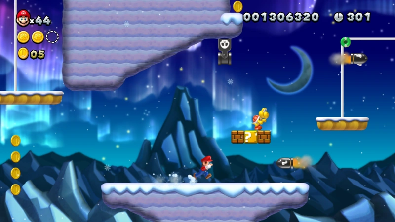 Like Spinning-Star Sky, the ground is covered with snow. The background contains many mountains, along with a dark-blue nighttime sky, various stars, and falling snowflakes. The level begins near Waddlewings and Bill Blasters. A ? Block is found, along with a Koopa Troopa. Using a Super Acorn, the player can fly to a ledge with coins and a ? Block with a 1-Up Mushroom. A few hills are found with Waddlewings on them. A few Scale Lifts are found above a pit. A group of four Bill Blasters is found before the Checkpoint Flag. Some Brick Blocks are found, along with a ? Block and some Waddlewing. There is also a Hidden Block containing a 1-Up Mushroom. A Scale Lift is found, which can be lowered to reach the next platform. A Koopa Troopa is found on a platform made of Brick Blocks and a ? Block, and another Scale Lift is found with two Bill Blasters. As the area continues, two more Scale Lifts are found with a Red Ring in the middle. A slope with three Waddlewings on it is found, followed by a group of Scale Lifts. Banzai Bills are fired from a Banzai Bill Cannon found just before the Goal Pole.