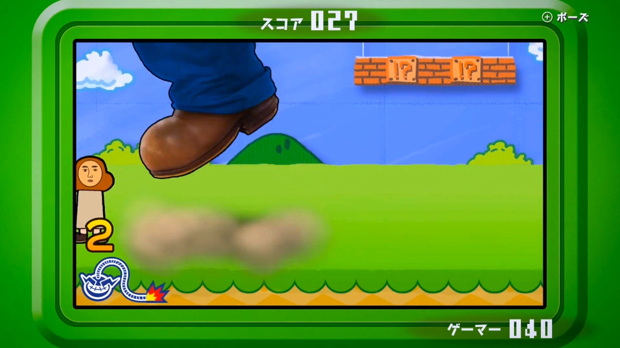 - Level 3: A person in a Goomba suit must try to be stomped by Mario's foot. The setting is based on Super Mario Bros.