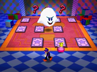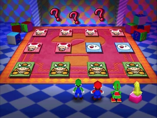 The cards flip over, showing the players where the six Toads, two Boos, and four Baby Bowsers are on the cards. The characters on them then turn into question marks before the cards flip back over, and they all get shuffled in three possible animations. They are then placed in the playing field facedown.