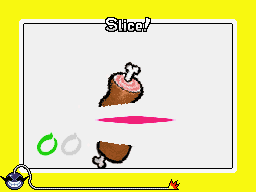 The objective of the game is to use the stylus to slice over the food that come across on the screen before the time runs out. If the player does so, the game is won. In Gold, Wario is the slicer and there is a chance that the player must separate cats from each other.