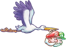 The Stork was carrying Mario and Luigi to deliver the babies to their homes. Kamek seized Baby Luigi and the stork but bungled Mario. Yoshi and his travel companions work together to help Mario save Luigi and the stork while Toadies attempted to chase them.[1] After the defeat of Baby Bowser, Mario reunited with Luigi and Yoshi freed the stork. The stork continued carrying Mario and Luigi to the parents' home and leaves Mario and Luigi by the porch.