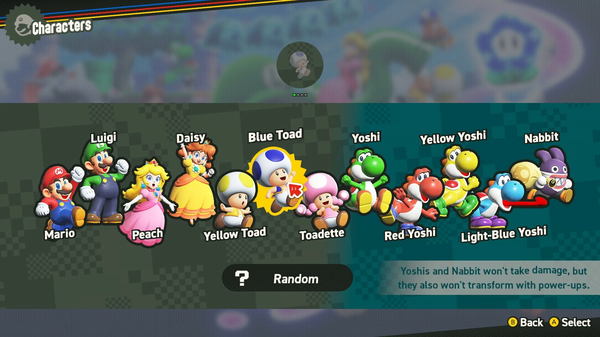 - This game has the most playable characters in Mario game since Super Mario Run, as this game has 12 playable characters: Mario (1), Luigi (2), Peach (3), Daisy (4), Light Blue Yoshi (5), Red Yoshi (6), Green Yoshi (7), Yellow Yoshi (8), Blue Toad (9), Yellow Toad (10), Toadette (11), and Nabbit (12).