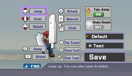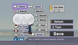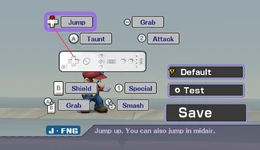 Players are able to set their own button configuration rather than have to play with the default configuration. The configuration can be saved on the Wii Remote's internal memory, allowing to take it to a friend's and play with one's own button configuration there. The Players are able to insert names with up to five letters, as in Super Smash Bros. Melee. In the previous game, names are only a gimmick. In this game, they now also save the players' controlling options to avoid having to select the control method each time.