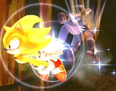 Super Smash Bros. Brawl official screenshot of Super Sonic charging into Pit