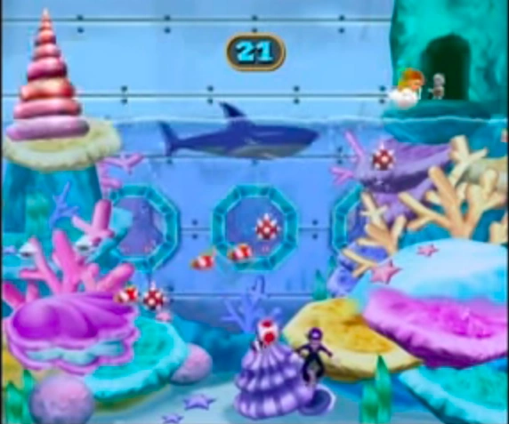 Sushis appears as hazards in Manta Rings of this game. Sushis are seen swimming around the course very rapidly and whenever a player comes into contact with a Sushi, then that player will lose 2 points.