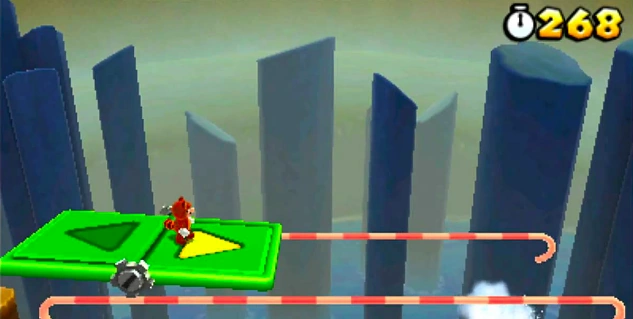 Switchboards are first seen in Super Mario 3D Land. In this game, they are first seen in World 1-3 and World 3-1 near the end of the level where they are used to reach the top of the Flagpole. They later appear in World 1-4, Special 2-3, and Special 5-3 as the centeral theme of the levels. Whenever Mario/Luigi stands on one side of the platform, the arrow will light up and the platform will move in that direction along the tracks. Sometimes, the track directions may need to be manipulated for the plumbers to continue moving down the correct path. Often times, the tracks will have guard rails at the end which stops the Switchboards from rolling further, if there are no guard rails, the Switchboard will fall down the tracks (usually falling on the lower tracks). If the Switchboards are hit by a Water Geyser, they will be sprung up and can also be hoisted to the upper tracks. Switchboards are extremely quick when rolling down steep tracks which can make them more difficult to control. Switchboards are also seen in a section of Special 8-Crown where the plumbers must move along the tracks whilst avoiding raining Tail Bob-ombs and spinning Firebars.
