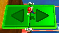 A Switchboard is a green platform with two triangular arrows on each side and two guiding wheels, one on each side. These platforms are usually used to cross large chasms and move along tracks specifically designed for them. Whenever Mario, Luigi, or another character jumps onto an Switchboard, depending on which side they're standing on, the arrow lights up yellow, and the platform begins to move in that direction. Mario or another character alternate between the left and right arrows to change the direction to better maneuver around the tracks. If there is no guard rail at the end of a track, the Switchboard can fall off if it continues moving, either causing Mario or another character to fall down a pit or onto another track set below. Switchboards can also be sprung up by a Water Geyser to reach higher tracks.